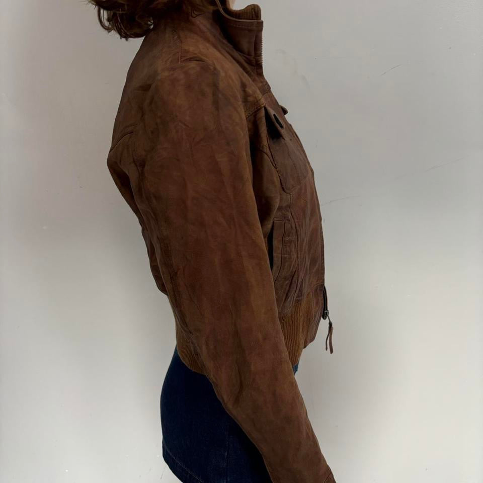 Boho moto brown leather jacket, has the cutest double pockets. Cropped brown leather moto jacket, so European gal chic.
