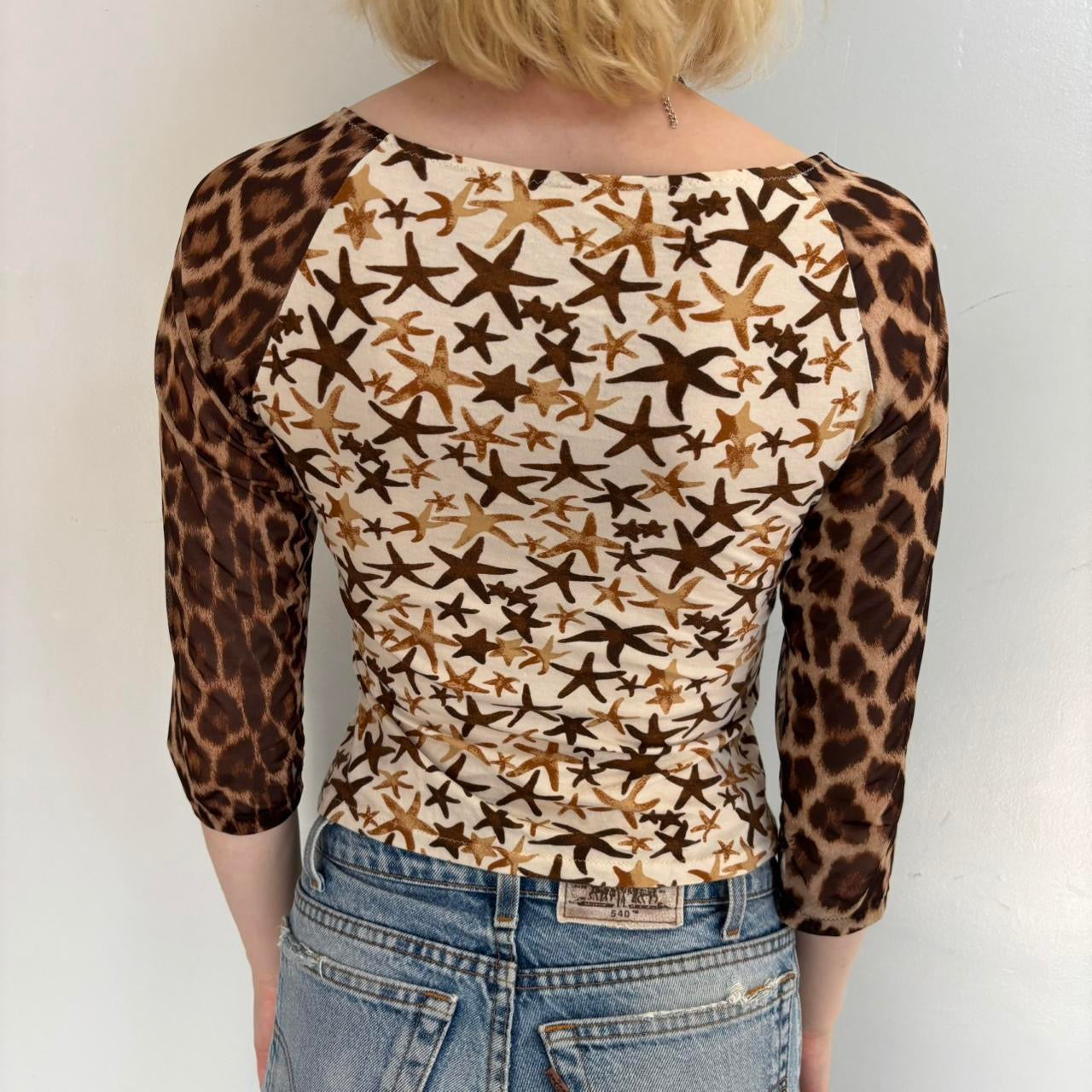 Y2k Star and Animal Print Long sleeve top, has animal print cheetah print half mesh long sleeves, low cut v neck, and tie details on the bottom.