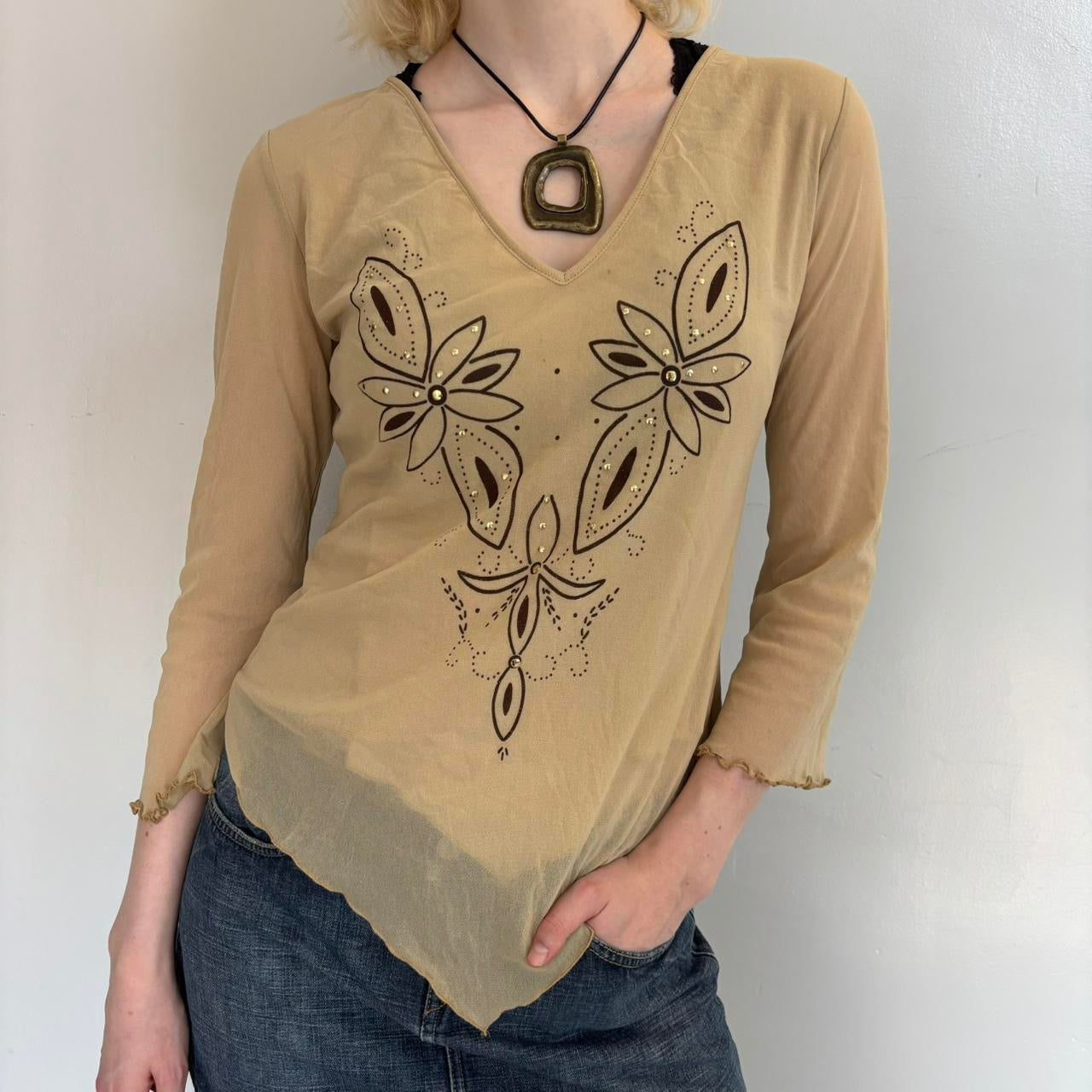 boho fairycore tan brown long sleeve with floral design with rhinestone detailing, half sleeve and mesh sleeves detailing