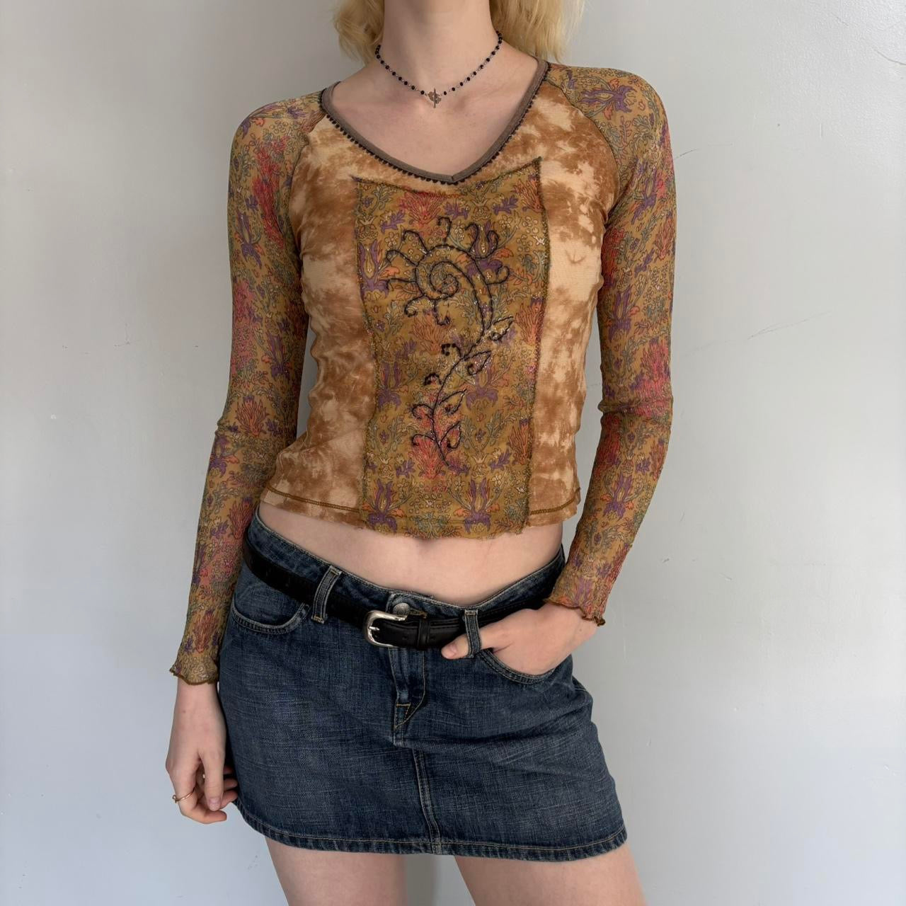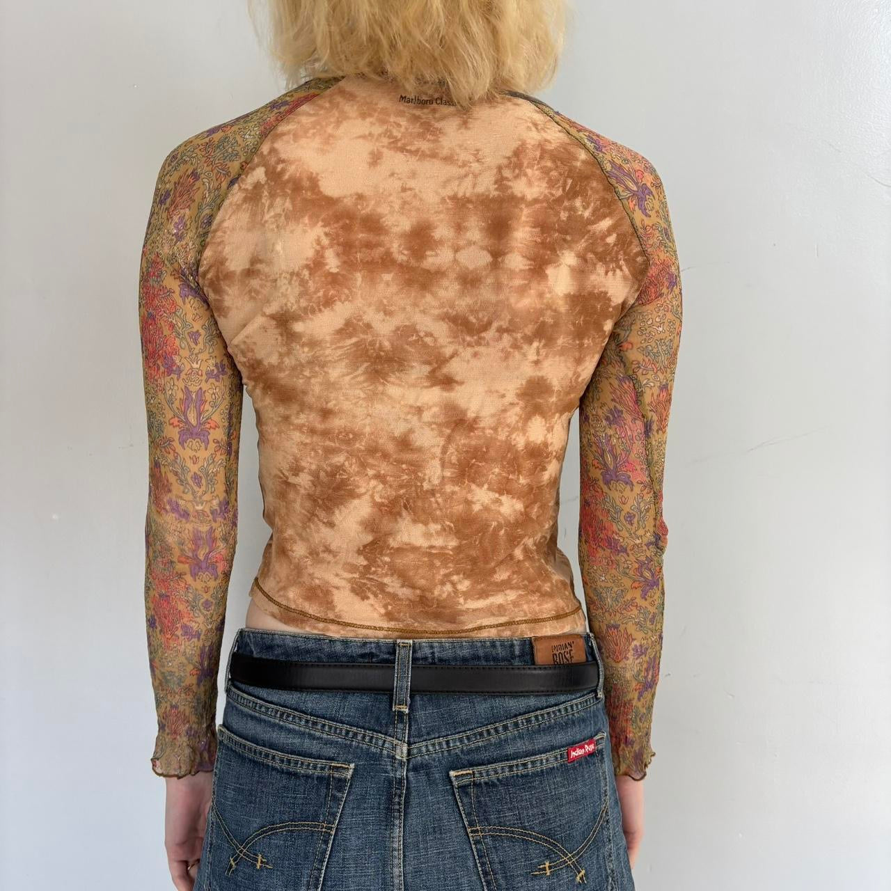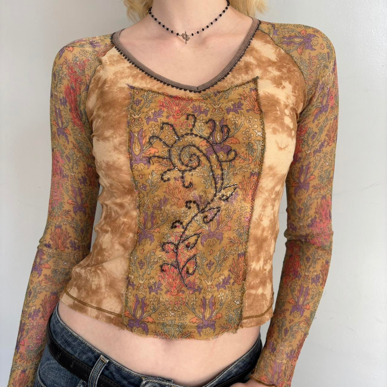 indie boho whimsical vintage Marlboro classics long sleeve mesh top! has sequins and embroidery ad detailing and a funky floral 70s print vibe <3