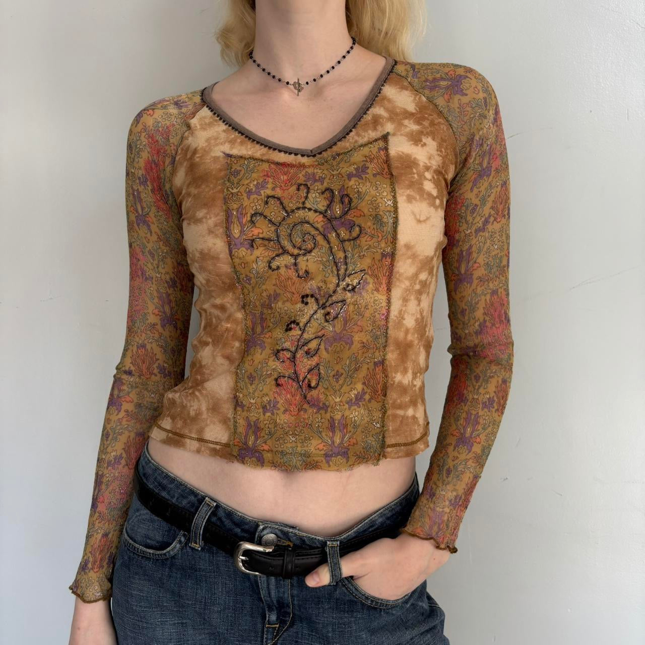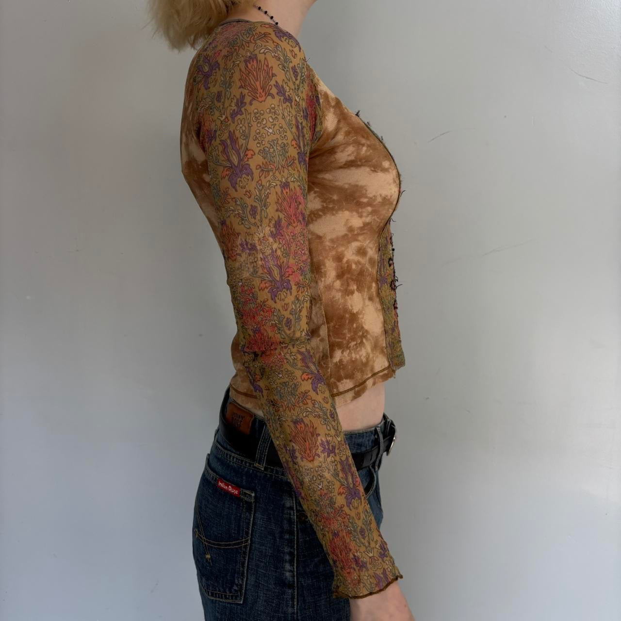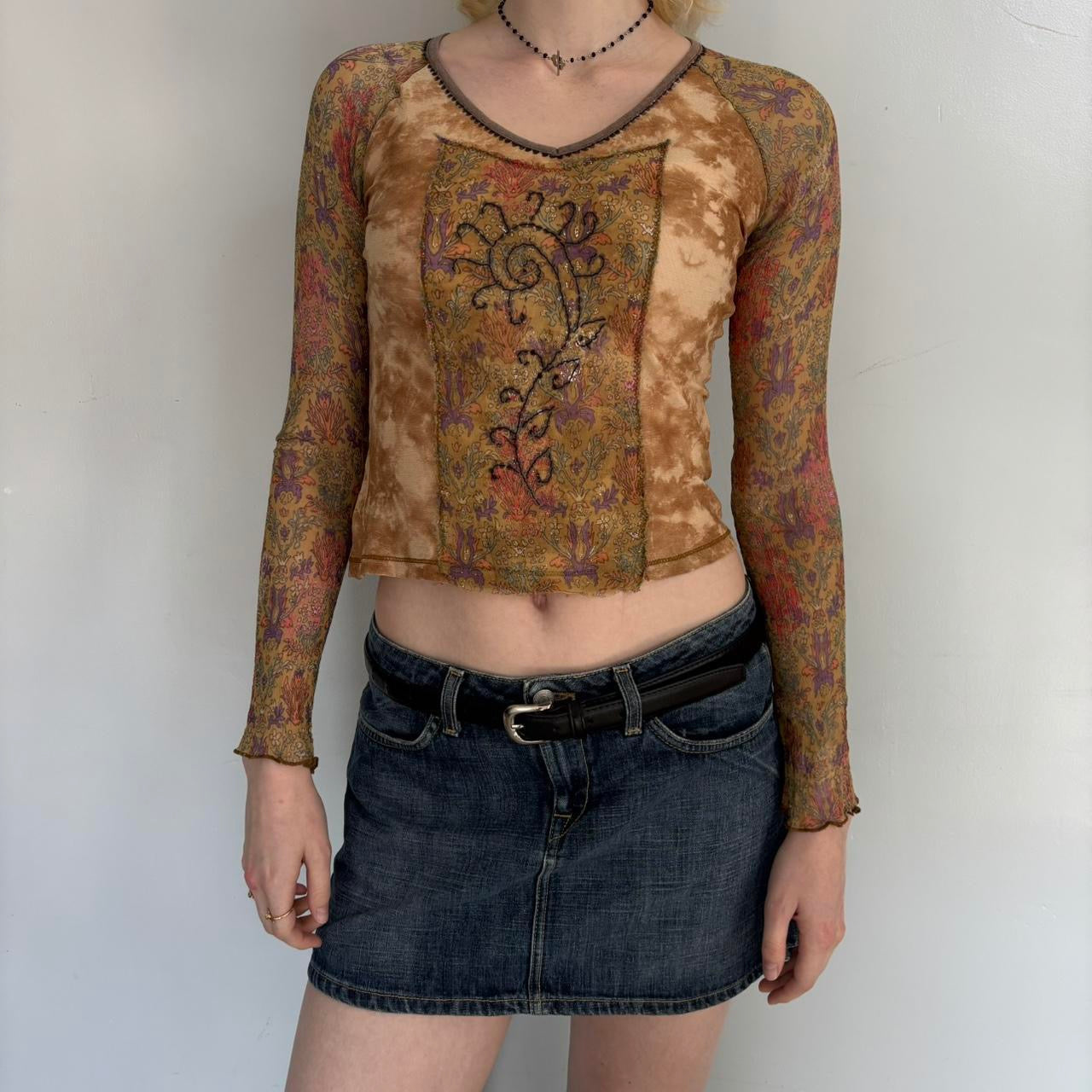 indie boho whimsical vintage Marlboro classics long sleeve mesh top! has sequins and embroidery ad detailing and a funky floral 70s print vibe <3
